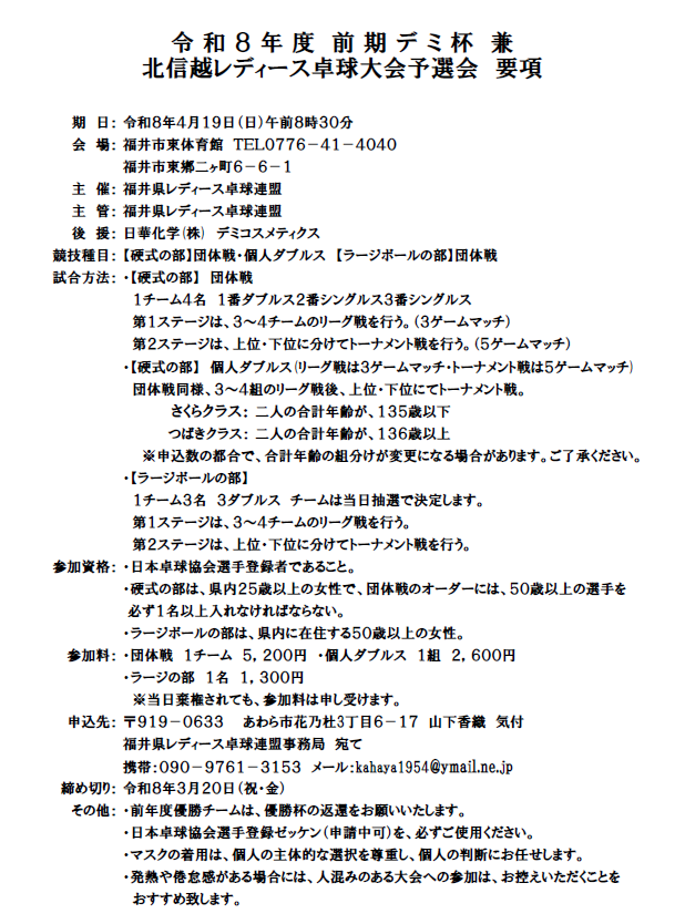 令和8年度前期デミ杯 兼 北信越レディース卓球大会予選会 要項