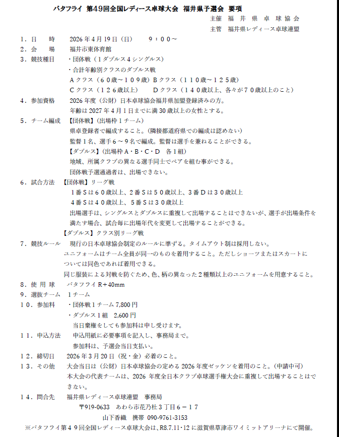 バタフライ 第49回全国レディース卓球大会 実施要項