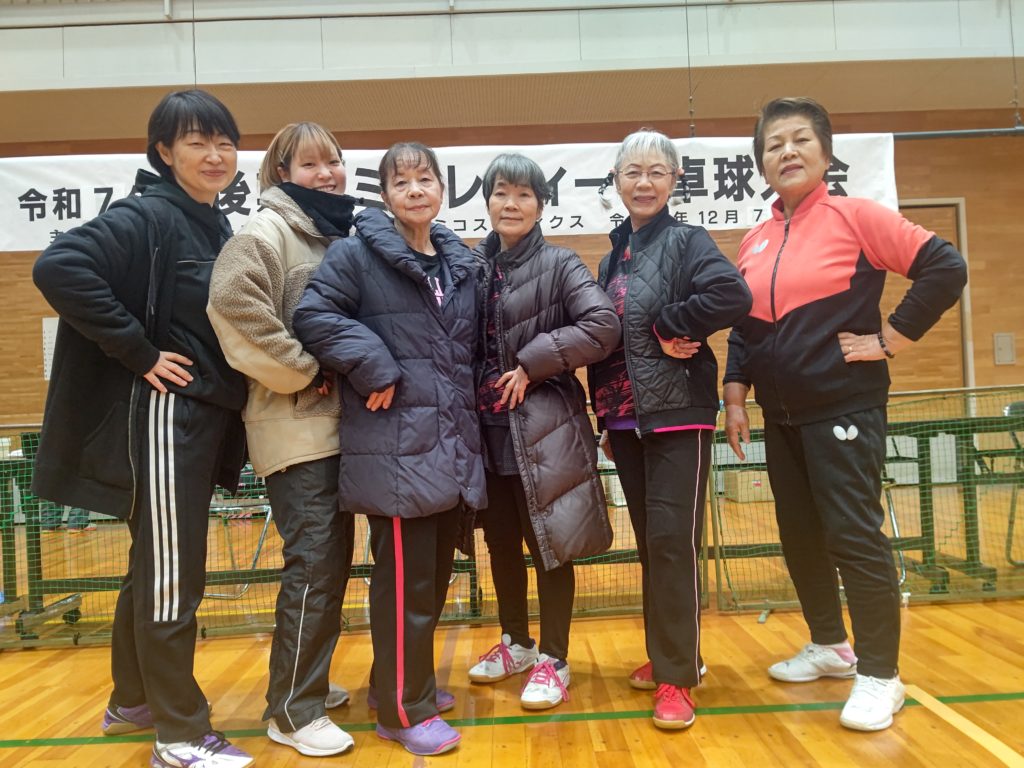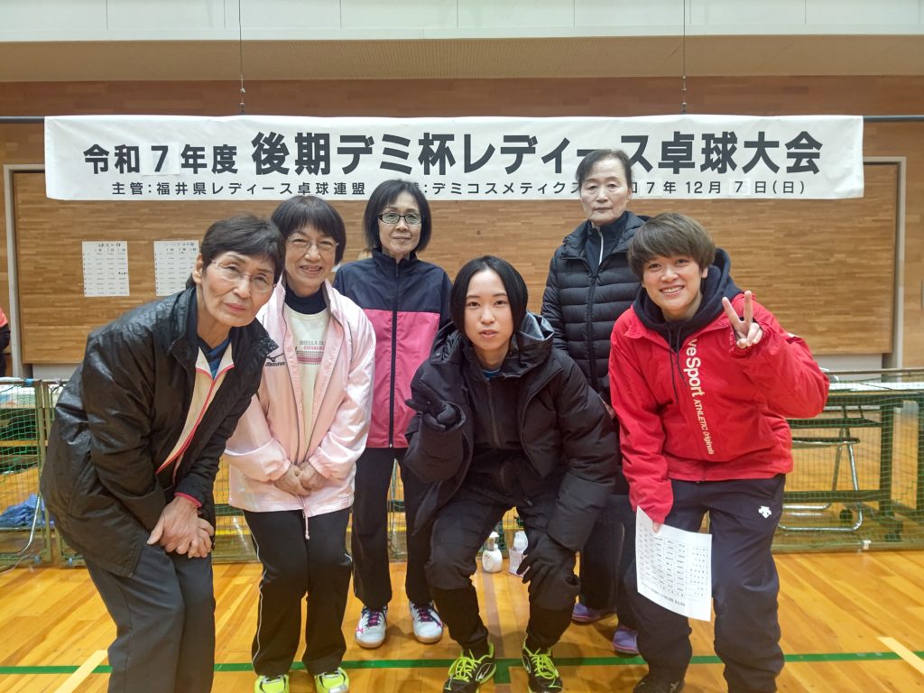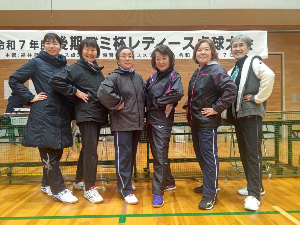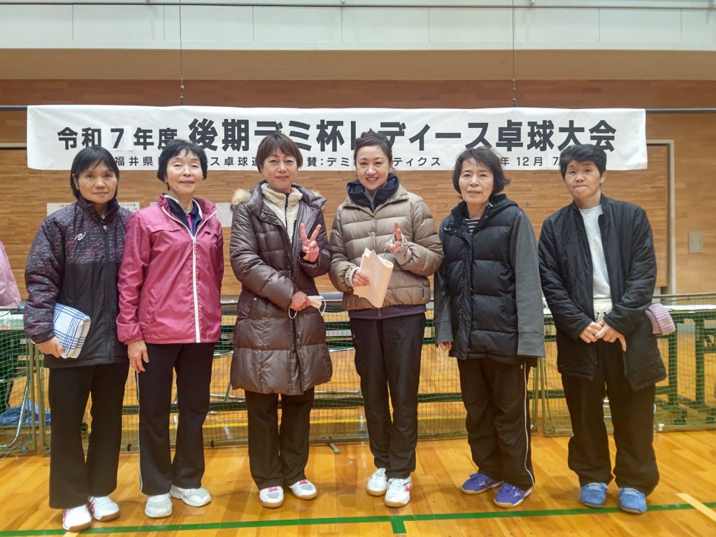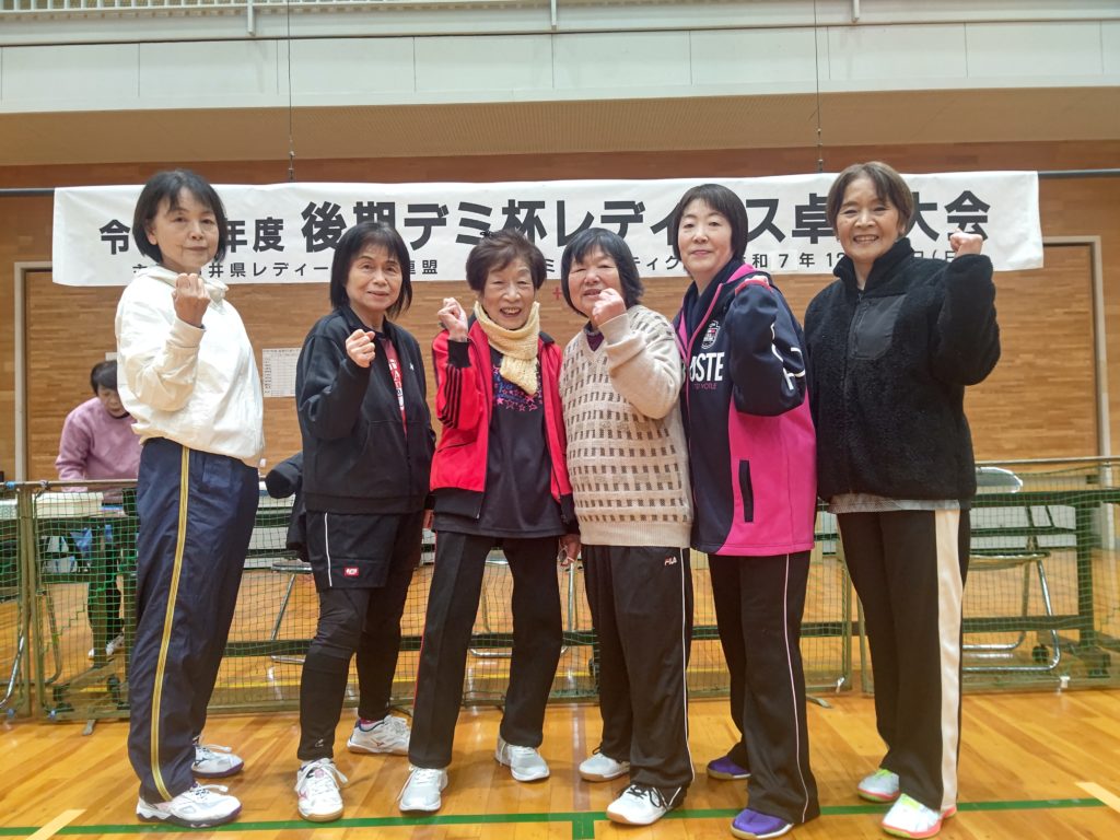 令和7年12月7日(日)福井市東体育館にて、上記の大会が行われました。昨年は雪が降り寒い中での開催でしたが、今年は晴天の元(体育館の中は寒かったですが)行われました。足下を心配しなくてもよかったので、有り難かったです。今大会は硬式・ラージボール共、当日の抽選でチーム分けをしました。硬式3名ラージボール3名で、シングルス2ダブルス2の団体戦です。できるだけ試合内容が楽しくなるようシングルスには、(全試合の内)最高3回まで出場できる(あとはダブルスに出場します)ルールーにしました。2ゲームでジュースなし。9チームの総当たりのリーグ戦です。全ての試合の得失点差で順位を決めます。2ゲームですので、試合終了時間に大差がないので、次の試合はスムーズに始められました。参加者全員のご協力もあり、試合進行がスムーズだったので、15時過ぎには全試合を終了することが出来ました。ご参加して下さいましたみなさま、ありがとうございました。普段は硬式とラージボールとの関わりが少ないので、この機会にお喋りができ、楽しい時間を過ごす事が出来ました。あとこの大会の素晴らしい事は、20代~90代の方のご参加があった事です。まさに生涯スポーツの意義に沿っている大会だと思います。これからも、健康で、楽しく、活力ある人生のために活動していきますので、ご協力・ご参加をよろしくお願い致します。