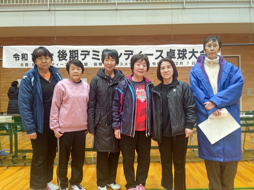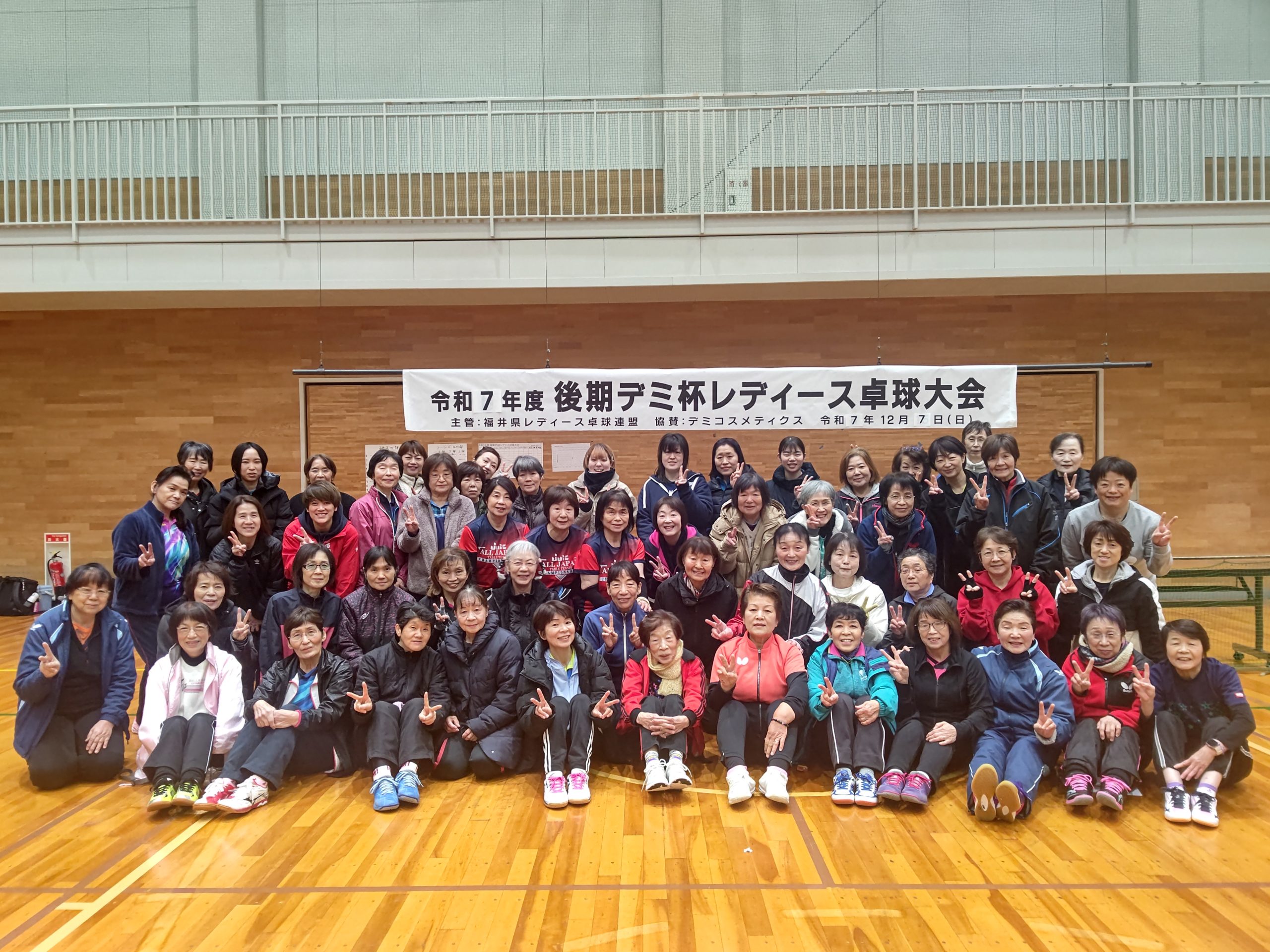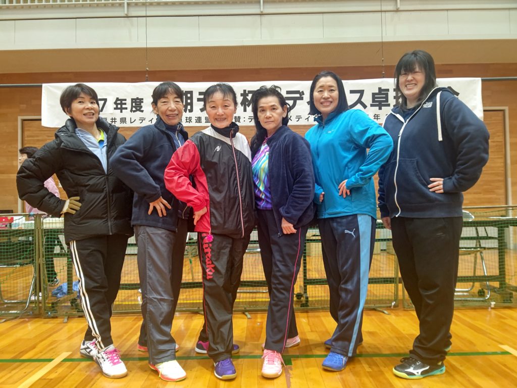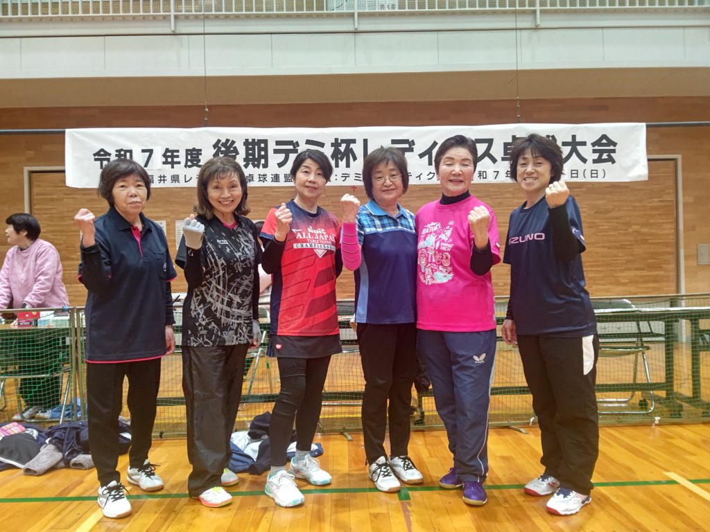 令和7年12月7日(日)福井市東体育館にて、上記の大会が行われました。昨年は雪が降り寒い中での開催でしたが、今年は晴天の元(体育館の中は寒かったですが)行われました。足下を心配しなくてもよかったので、有り難かったです。今大会は硬式・ラージボール共、当日の抽選でチーム分けをしました。硬式3名ラージボール3名で、シングルス2ダブルス2の団体戦です。できるだけ試合内容が楽しくなるようシングルスには、(全試合の内)最高3回まで出場できる(あとはダブルスに出場します)ルールーにしました。2ゲームでジュースなし。9チームの総当たりのリーグ戦です。全ての試合の得失点差で順位を決めます。2ゲームですので、試合終了時間に大差がないので、次の試合はスムーズに始められました。参加者全員のご協力もあり、試合進行がスムーズだったので、15時過ぎには全試合を終了することが出来ました。ご参加して下さいましたみなさま、ありがとうございました。普段は硬式とラージボールとの関わりが少ないので、この機会にお喋りができ、楽しい時間を過ごす事が出来ました。あとこの大会の素晴らしい事は、20代~90代の方のご参加があった事です。まさに生涯スポーツの意義に沿っている大会だと思います。これからも、健康で、楽しく、活力ある人生のために活動していきますので、ご協力・ご参加をよろしくお願い致します。